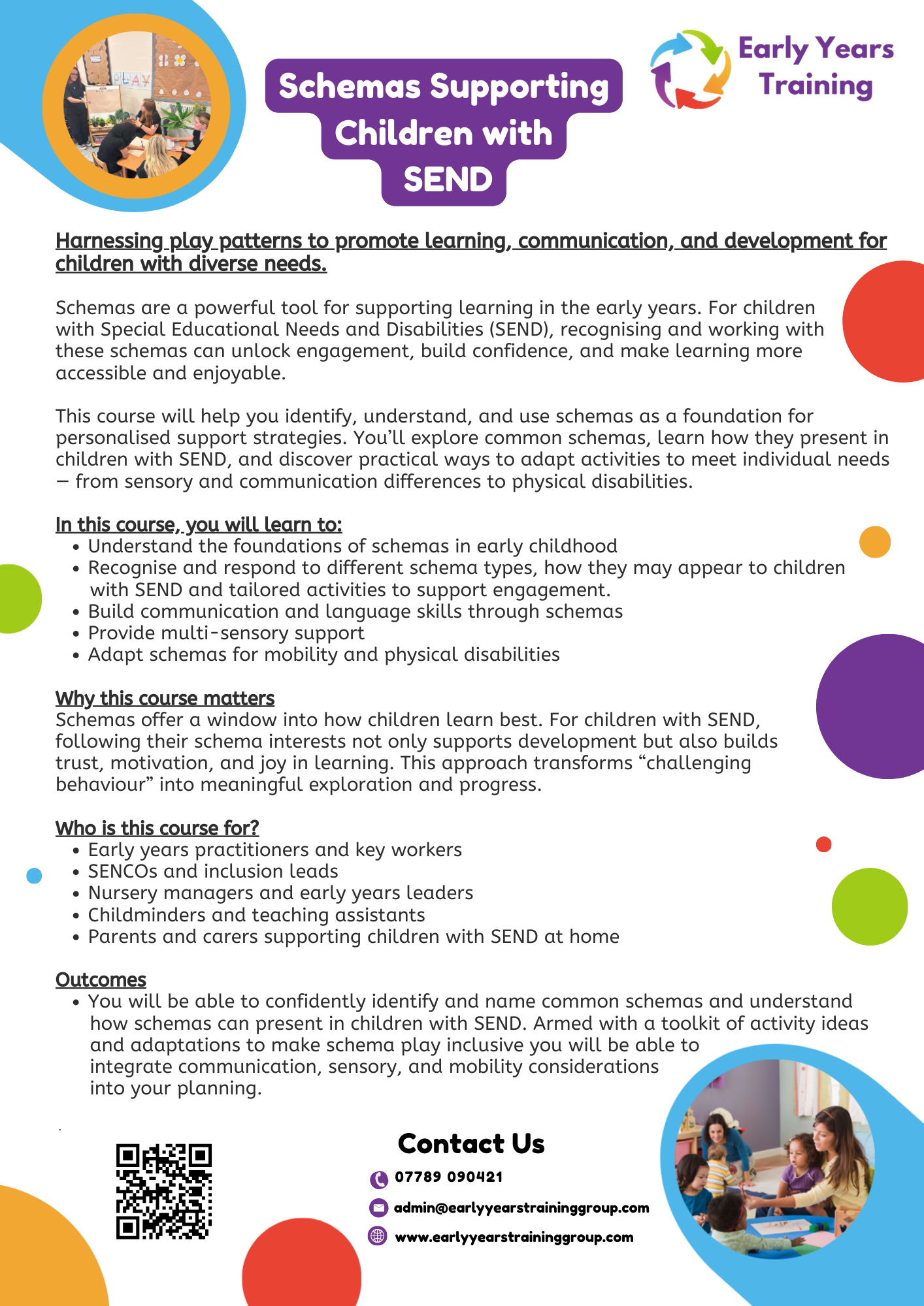 - Recognise and respond to different schema types, how they may appear to children with SEND and tailored activities to support engagement.